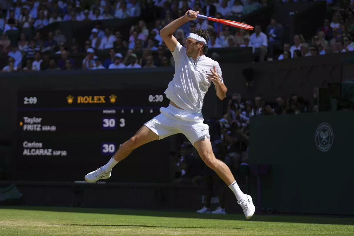 Taylor Fritz of the U.S. returns to Spain's Carlos Alcaraz in a men's singles semifinal at the Wimbledon Tennis Championships in London, Friday, July 11, 2025. (AP Photo/Joanna Chan)