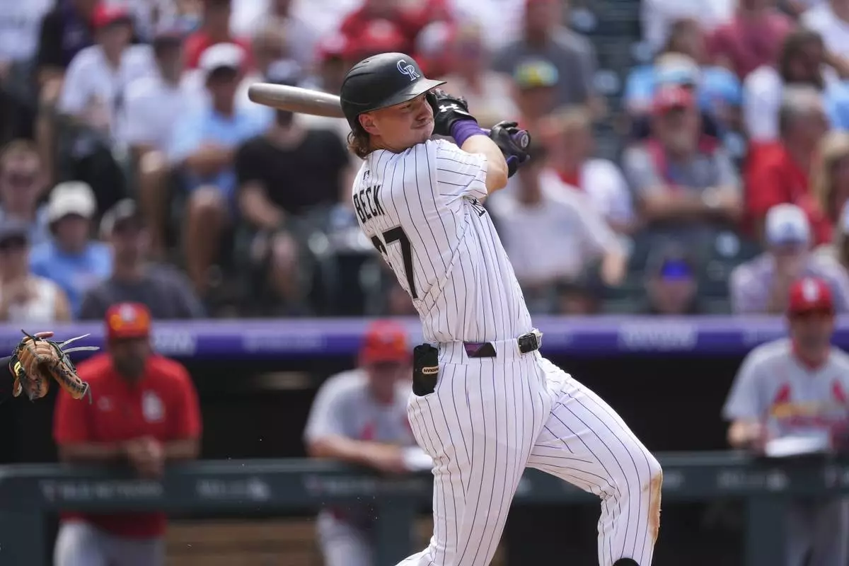 Colorado Rockies' Jordan Beck singles against St. Louis Cardinals relief pitcher Andre Granillo in the seventh inning of a baseball game Wednesday, July 23, 2025, in Denver. (AP Photo/David Zalubowski)