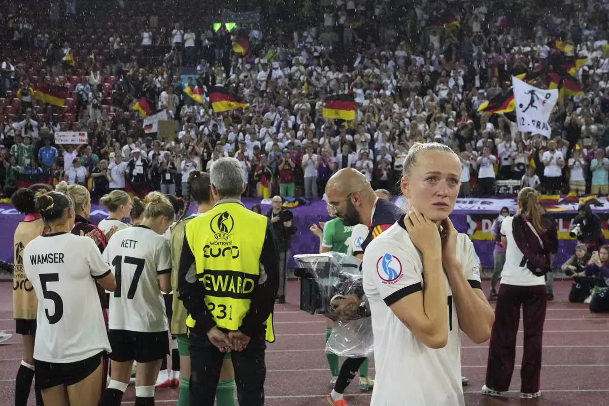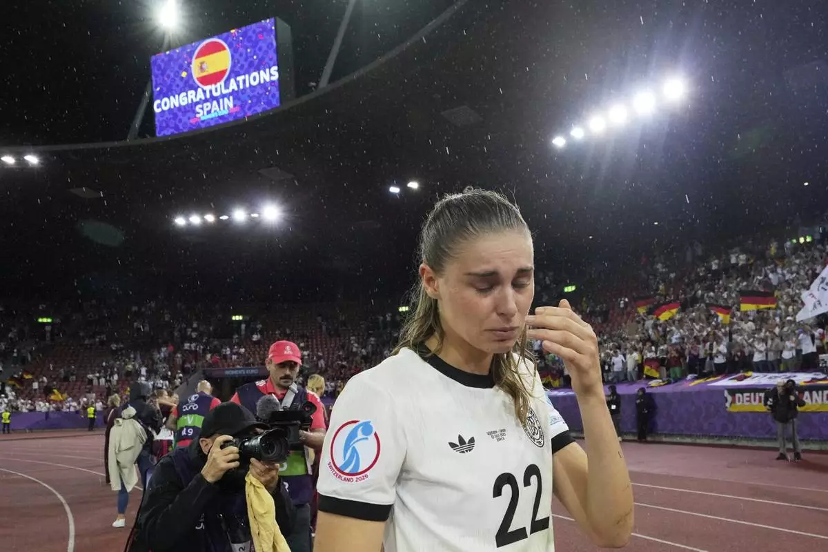 Germany's Klara Buehl reacts after the Women's Euro 2025 semifinal soccer match between Germany and Spain at the Letzigrund stadium in Zurich, Switzerland, Wednesday, July 23, 2025. (Til Buergy/Keystone via AP)
