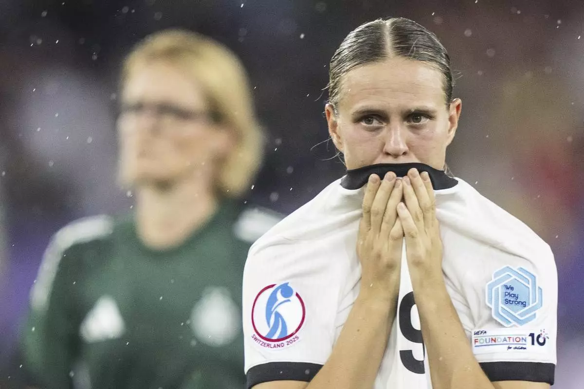 Germany's Lea Schueller reacts after the Women's Euro 2025 semifinals soccer match between Germany and Spain at Stadion Letzigrund in Zurich, Switzerland, Wednesday, July 23, 2025. (AP Photo/Martin Meissner)