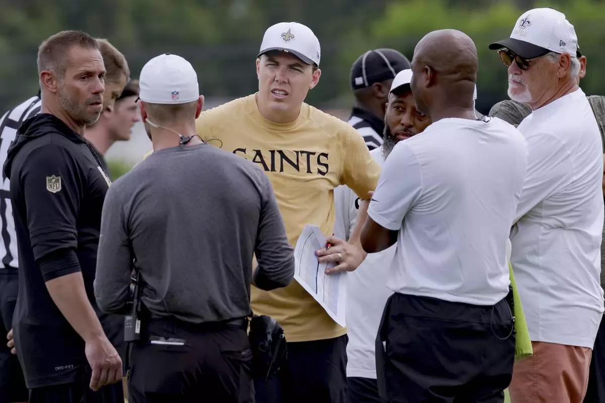 New Orleans Saints head coach Kellen Moore, center, talks with staff and executive vice president/general manager Mickey Loomis, right, during the team's NFL football training camp in Metairie, La., Wednesday, July 23, 2025. (AP Photo/Matthew Hinton)