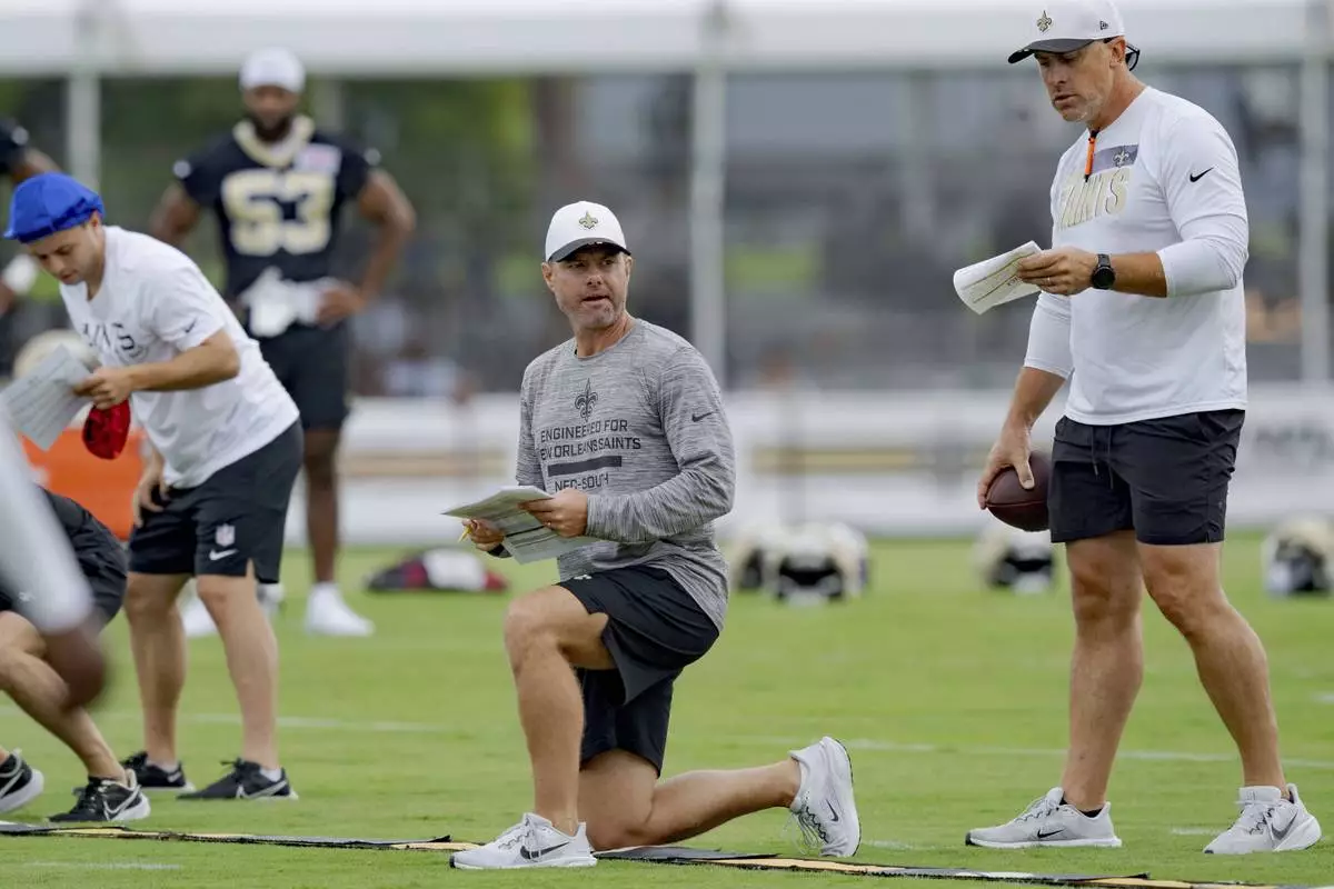 New Orleans Saints defensive coordinator Brandon Staley, center, coaches during the team's NFL football training camp in Metairie, La., Wednesday, July 23, 2025. (AP Photo/Matthew Hinton)