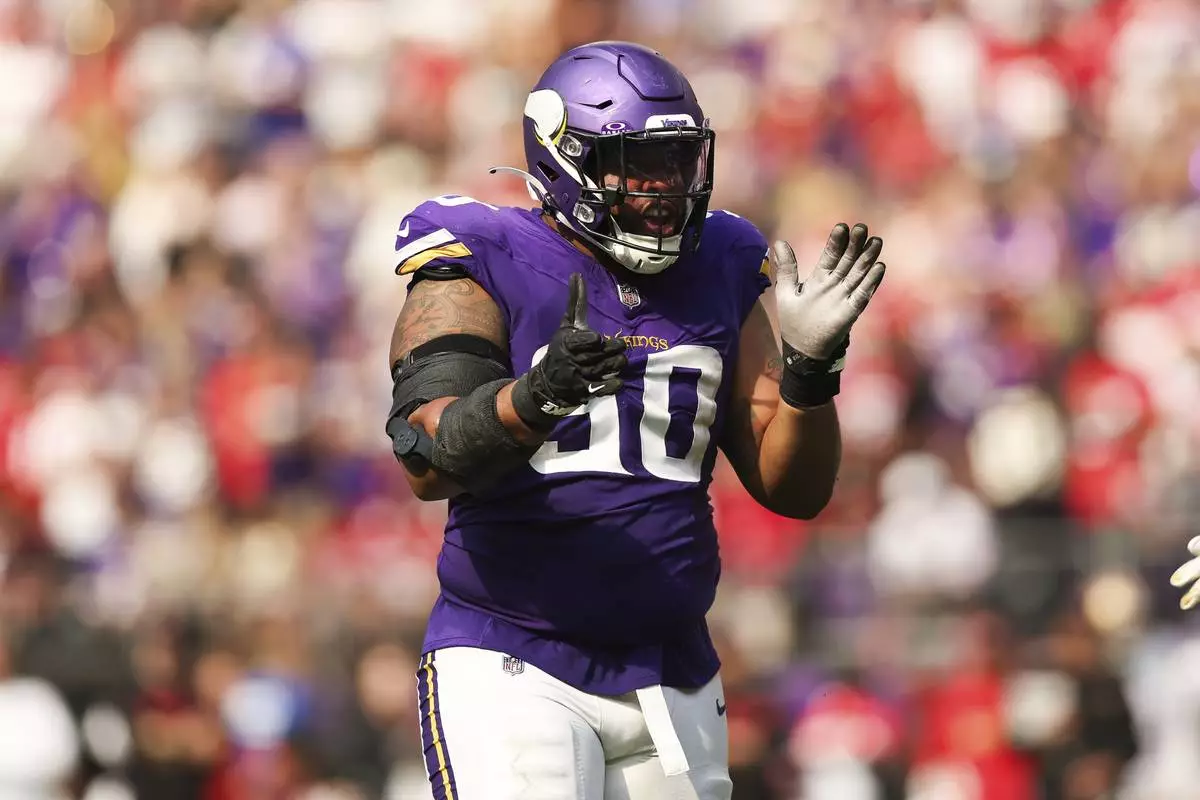 FILE - Minnesota Vikings defensive end Jonathan Bullard reacts after a play during the second half of an NFL football game against the San Francisco 49ers, Sept. 15, 2024 in Minneapolis. (AP Photo/Stacy Bengs, File)