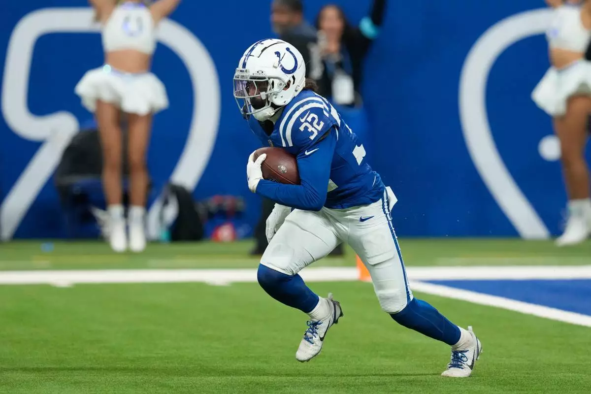 FILE - Indianapolis Colts safety Julian Blackmon (32) runs with the ball after making an interception during the second half of an NFL football game against the Jacksonville Jaguars, Jan. 5, 2025, in Indianapolis. (AP Photo/Darron Cummings, File)