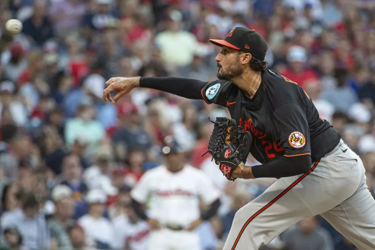 Baltimore Orioles starting pitcher Zach Eflin delivers against the Cleveland Guardians during the fifth inning of a baseball game, Wednesday, July 23, 2025, in Cleveland. (AP Photo/Phil Long)