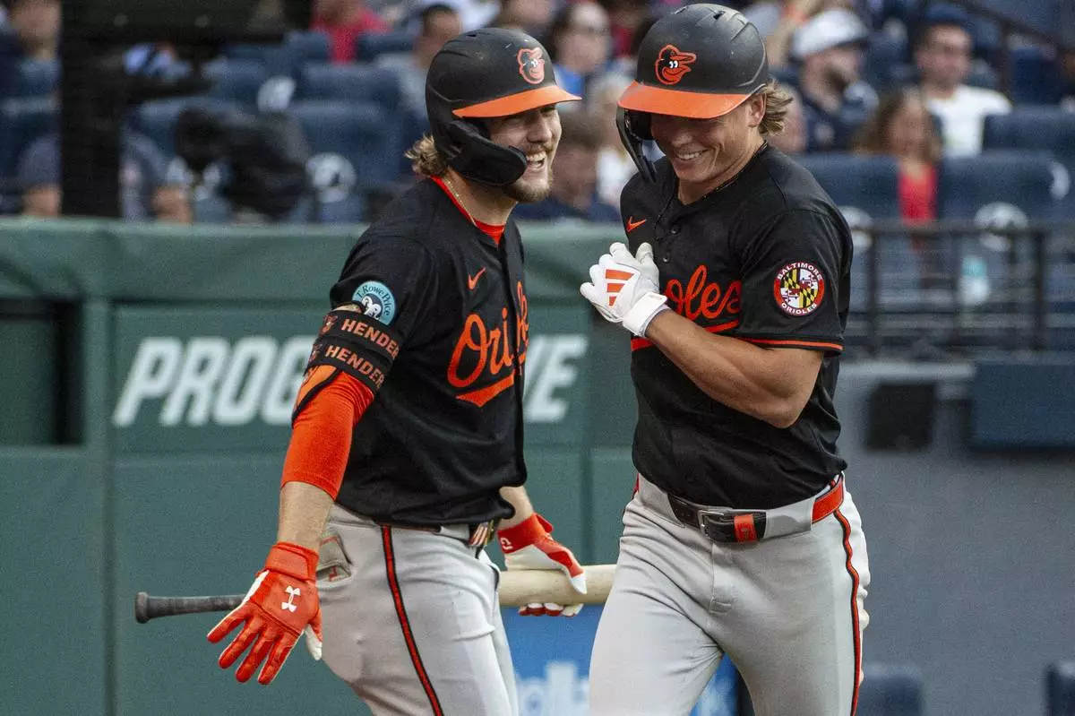 Baltimore Orioles' Gunnar Henderson, left, congratulates Jackson Holliday after his solo home run off Cleveland Guardians starting pitcher Slade Cecconi during the sixth inning of a baseball game, Wednesday, July 23, 2025, in Cleveland. (AP Photo/Phil Long)