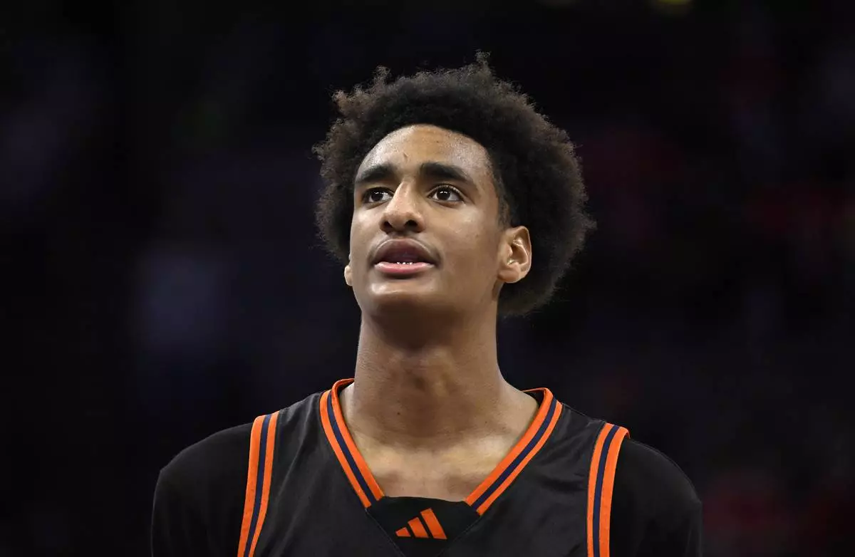 FILE - Chatsworth High School basketball player Alijah Arenas prepares to shoot a free throw in the second half of a boys CIF State Division II championship basketball game in Sacramento, March 15, 2025. (Keith Birmingham/The Orange County Register via AP, File)