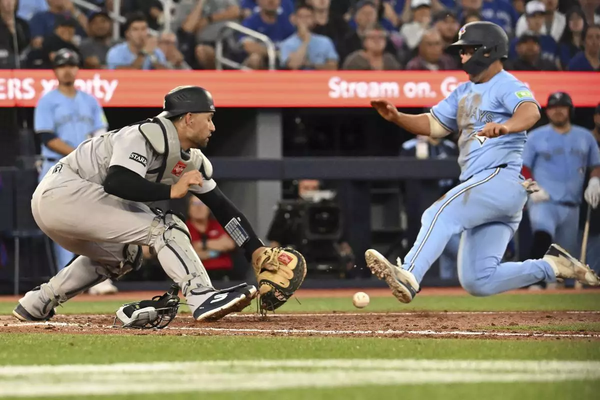 Toronto Blue Jays' Davis Schneider, right, scores a run ahead of a tag by New York Yankees catcher J.C. Escarra in the fifth inning of a baseball game in Toronto on Wednesday, July 23, 2025. (Jon Blacker/The Canadian Press via AP)