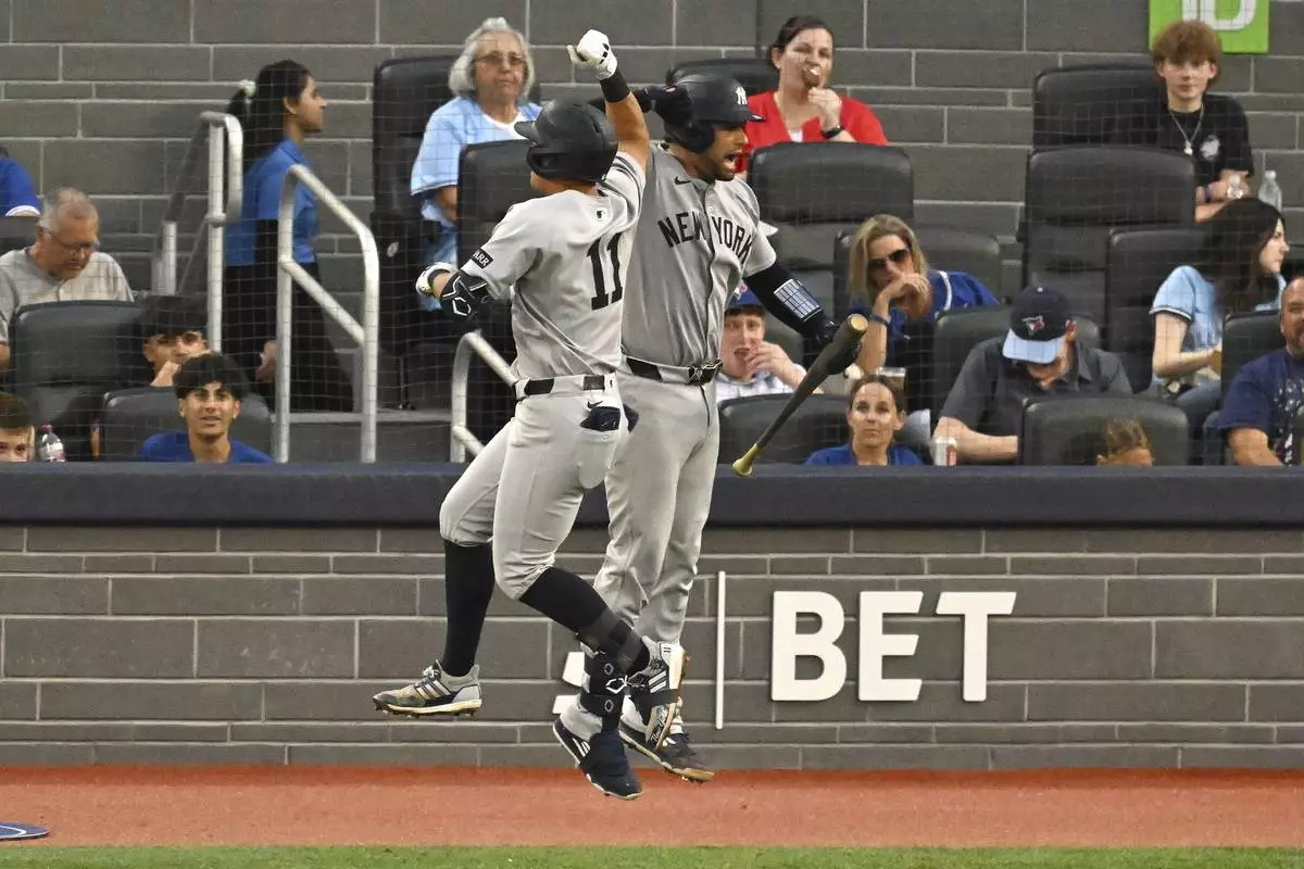 New York Yankees' Anthony Volpe (11) and Oswald Peraza, right, celebrate Volpe's solo home run against the Toronto Blue Jays in the fifth inning of a baseball game in Toronto on Wednesday, July 23, 2025. (Jon Blacker/The Canadian Press via AP)