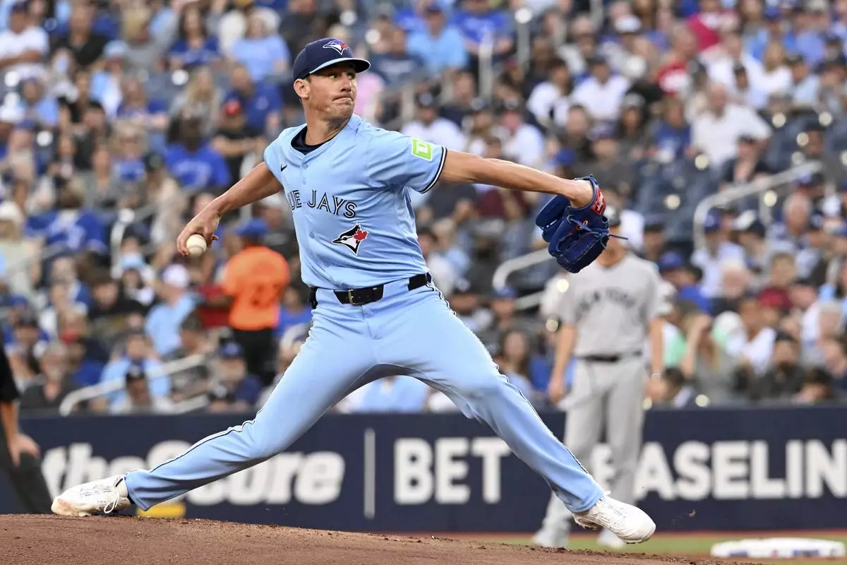 Toronto Blue Jays starting pitcher Chris Bassitt (40) throws to a New York Yankees batter in first inning of a baseball game in Toronto on Wednesday, July 23, 2025. (Jon Blacker/The Canadian Press via AP)