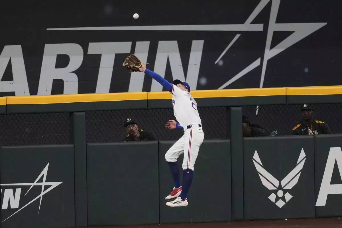 Texas Rangers center fielder Michael Helman makes a leaping catch on a fly out by the Athletics' Tyler Soderstrom in the sixth inning of a baseball game, Wednesday, July 23, 2025, in Arlington, Texas. (AP Photo/Tony Gutierrez)