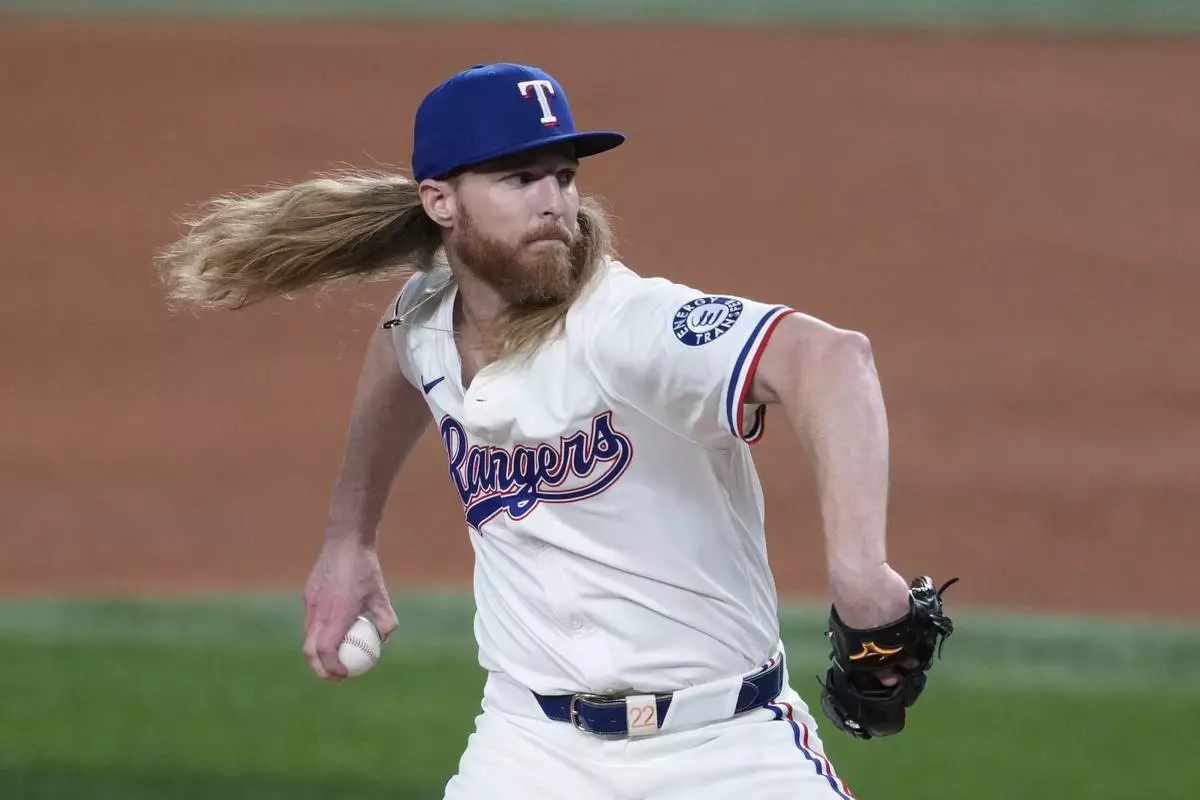 Texas Rangers relief pitcher Jon Gray throws to the Athletics in the sixth inning of a baseball game, Wednesday, July 23, 2025, in Arlington, Texas. (AP Photo/Tony Gutierrez)