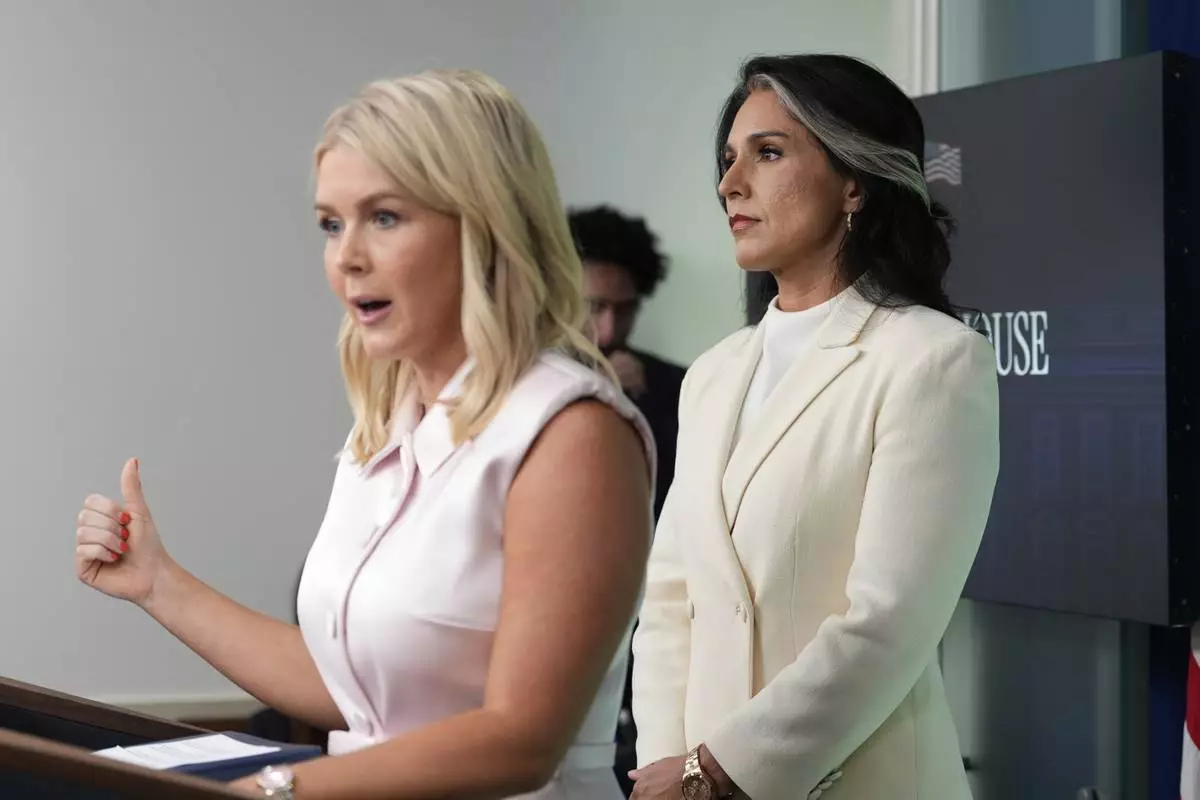 White House press secretary Karoline Leavitt and Director of National Intelligence Tulsi Gabbard, speak with reporters in the James Brady Press Briefing Room at the White House, Wednesday, July 23, 2025, in Washington. (AP Photo/Alex Brandon)