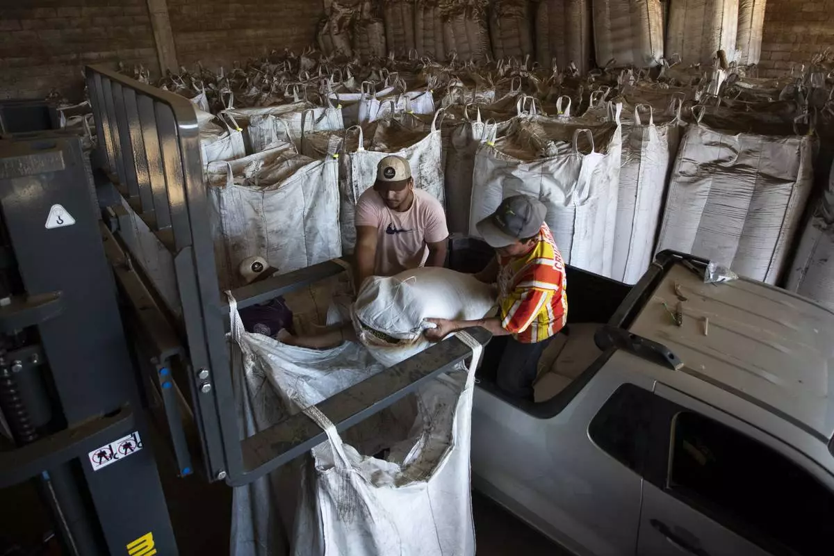 Workers store coffee beans in a warehouse at the Vargas coffee plantation in Varre-Sai, Rio de Janeiro state, Brazil, Friday, July 18, 2025. (AP Photo/Bruna Prado)