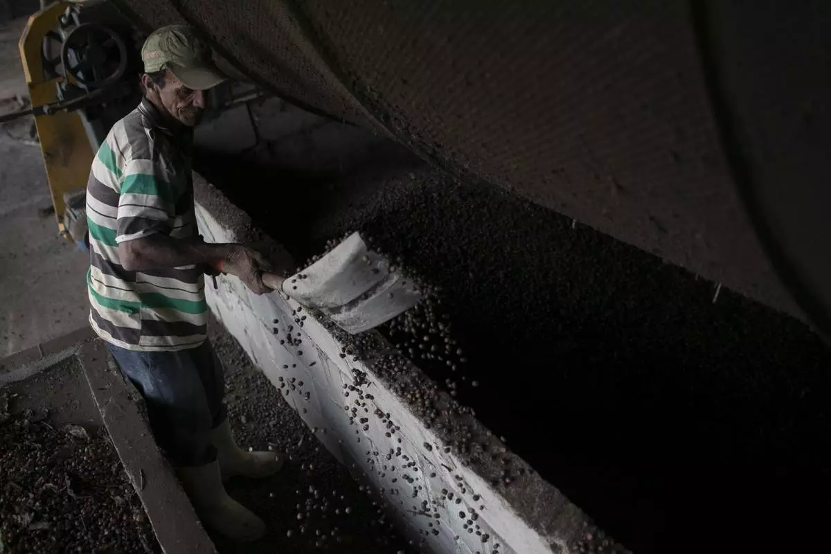A worker pours coffee beans into drying equipment on a coffee farm in Porciuncula, Rio de Janeiro state, Brazil, Thursday, July 17, 2025. (AP Photo/Bruna Prado)