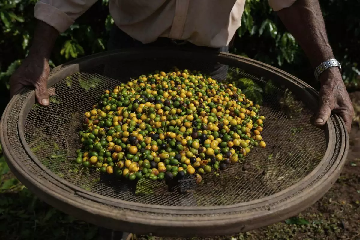 Natan Jose Marssola da Silva, left, sifts coffee beans on his father's farm in Porciuncula, Rio de Janeiro state, Brazil, Thursday, July 17, 2025. (AP Photo/Bruna Prado)