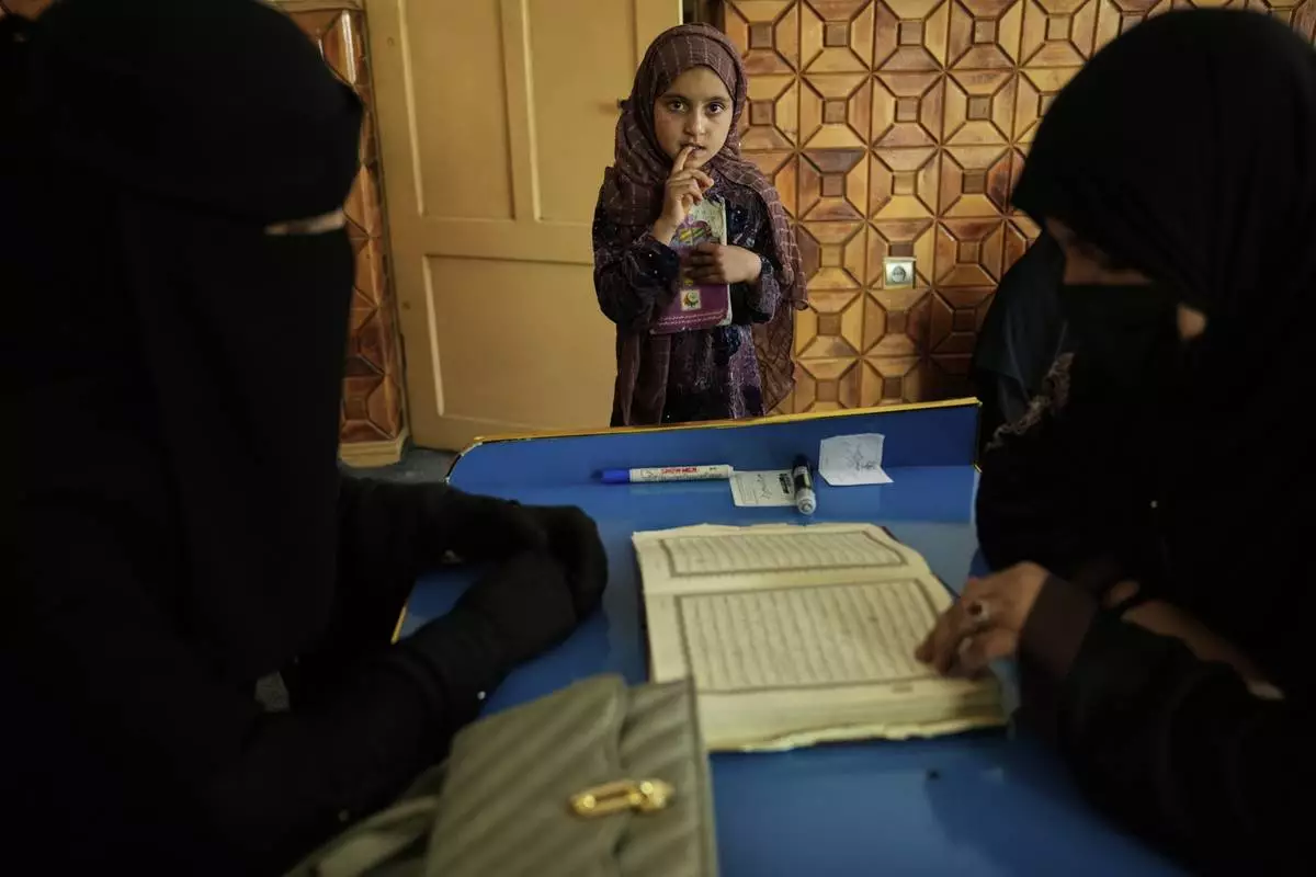 A teacher gives a religious studies lesson to girls at a religious education center in Kabul, Afghanistan, Wednesday, May 28, 2025. (AP Photo/Ebrahim Noroozi)