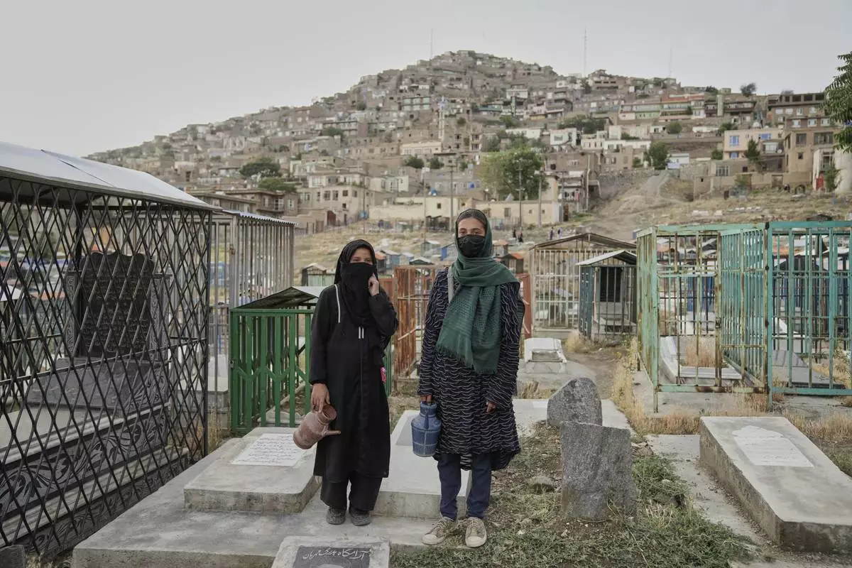 Nahideh, 13, left, an Afghan girl, stands with her friend as they wait for customers to buy water at a cemetery in Kabul, Afghanistan, Tuesday, May 27, 2025. (AP Photo/Ebrahim Noroozi)