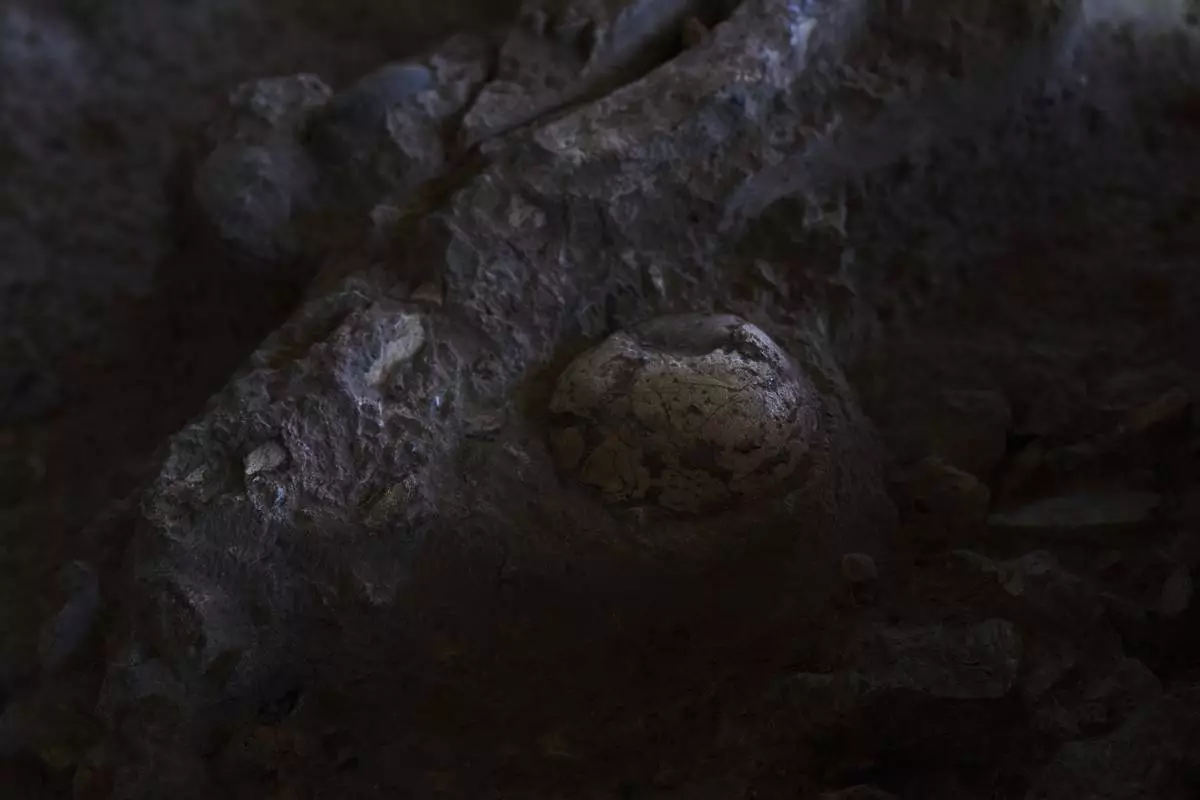 At the entrance to the cave, the skull of one of the early humans is slowly emerging from the rock sediment; it will be years before it is fully excavated.