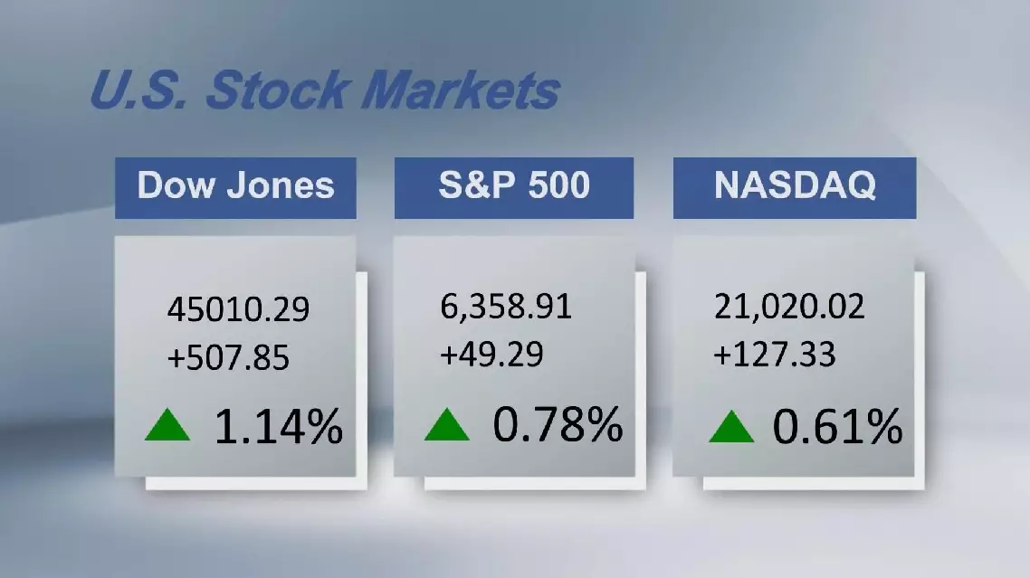 The Dow Jones Industrial Average climbed 507.85 points, or 1.14 percent, to finish at 45,010.29, just shy of a record close. The Standard and Poor's 500 gained 0.78 percent to notch a new record close at 6,358.91. The Nasdaq Composite advanced 127.33 points, or 0.61 percent, to 21,020.02, marking its first-ever close above the 21,000 mark.
