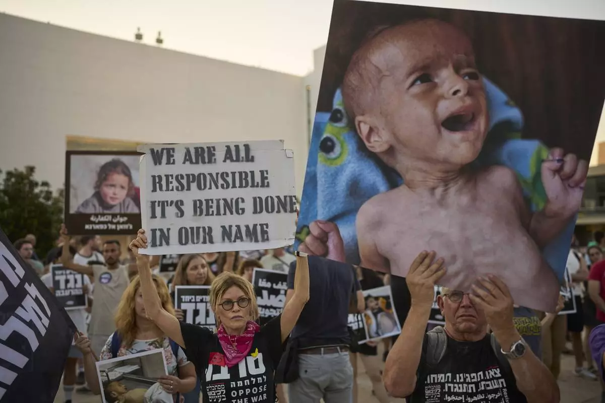 Israeli activists take part in a protest against the war in the Gaza Strip, Israel's measures regarding food distribution and the forced displacement of Palestinians, in Tel Aviv, Israel, Tuesday, July 22, 2025. (AP Photo/Ohad Zwigenberg)