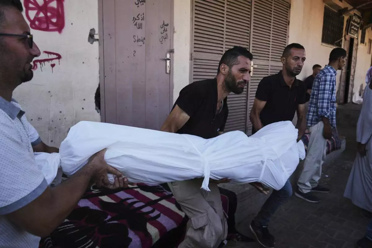 Mourners carry the body Ibrahim Al-Khatib who was killed in an Israeli bombardment of Al-Zawaideh, central Gaza Strip, Thursday, July 24, 2025. (AP Photo/Abdel Kareem Hana)