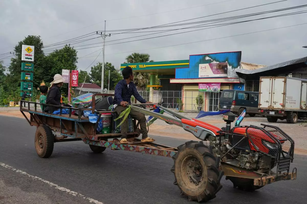 A Cambodian family returning home from a temporary shelter drive past a gas station damaged in Phrong village, Oddar Meanchey province, Cambodia, Wednesday, July 30, 2025, after a ceasefire to end deadly border clashes was reached between Thailand and Cambodia. (AP Photo/Heng Sinith)