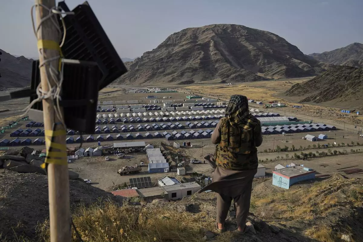 FILE -A Taliban fighter stands on a hill overlooking a camp housing Afghan refugees who have been repatriated from Pakistan, near the Pakistan-Afghanistan border, in Torkham, Afghanistan, May 31, 2025. (AP Photo/Ebrahim Noroozi, File)