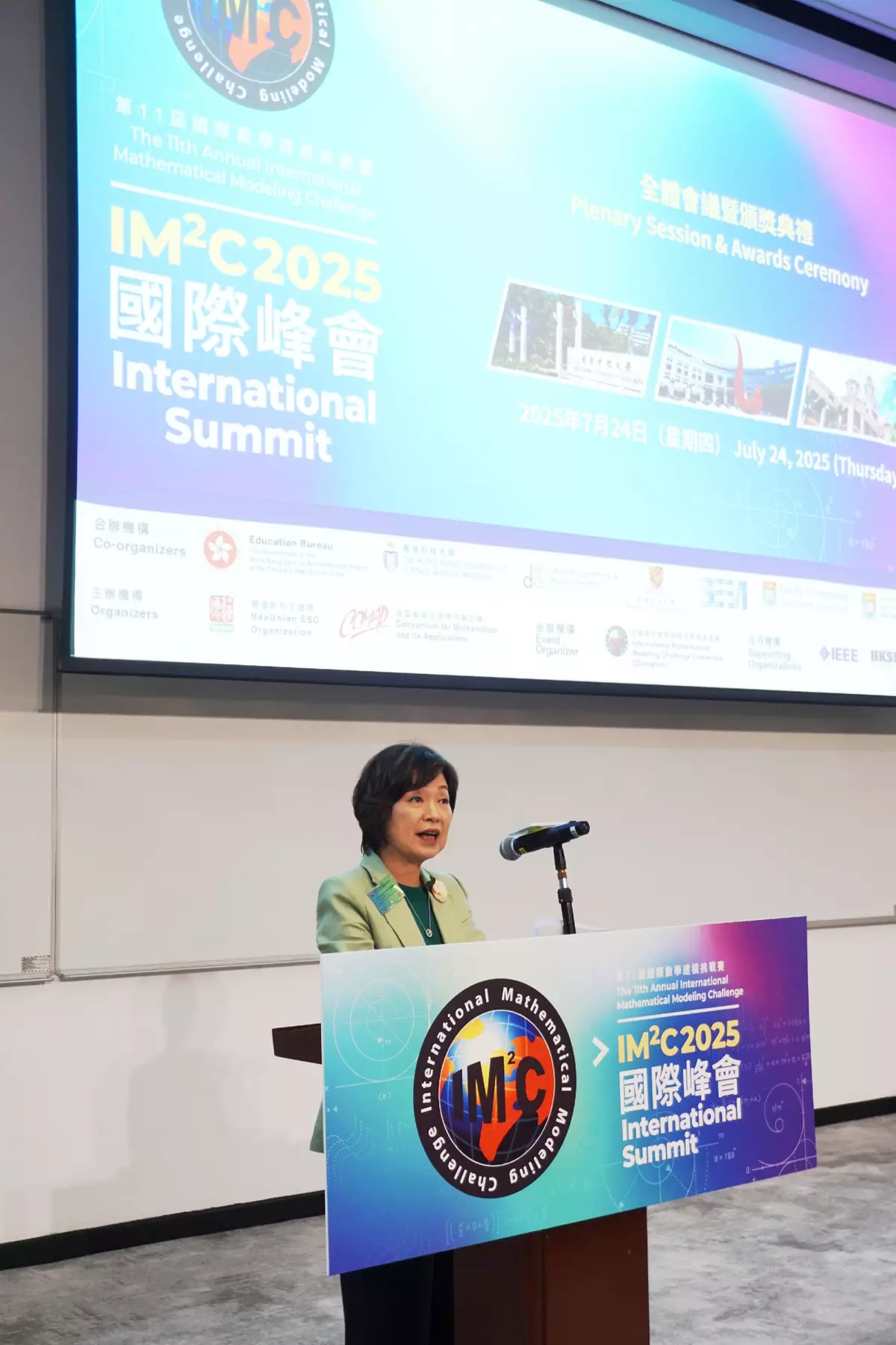 The Education Bureau (EDB) today (July 24), together with the NeoUnion ESC Organization, the Consortium for Mathematics and Its Applications, the Hong Kong University of Science and Technology, the Chinese University of Hong Kong and the University of Hong Kong, co-organised the 11th Annual International Mathematical Modeling Challenge (IMMC) International Summit cum Award Ceremony, in which global experts were invited to share their insights on various topics to promote local and international exchanges in mathematics education. The Secretary for Education, Dr Choi Yuk-lin, officiated at the ceremony and presented awards to the winning students.