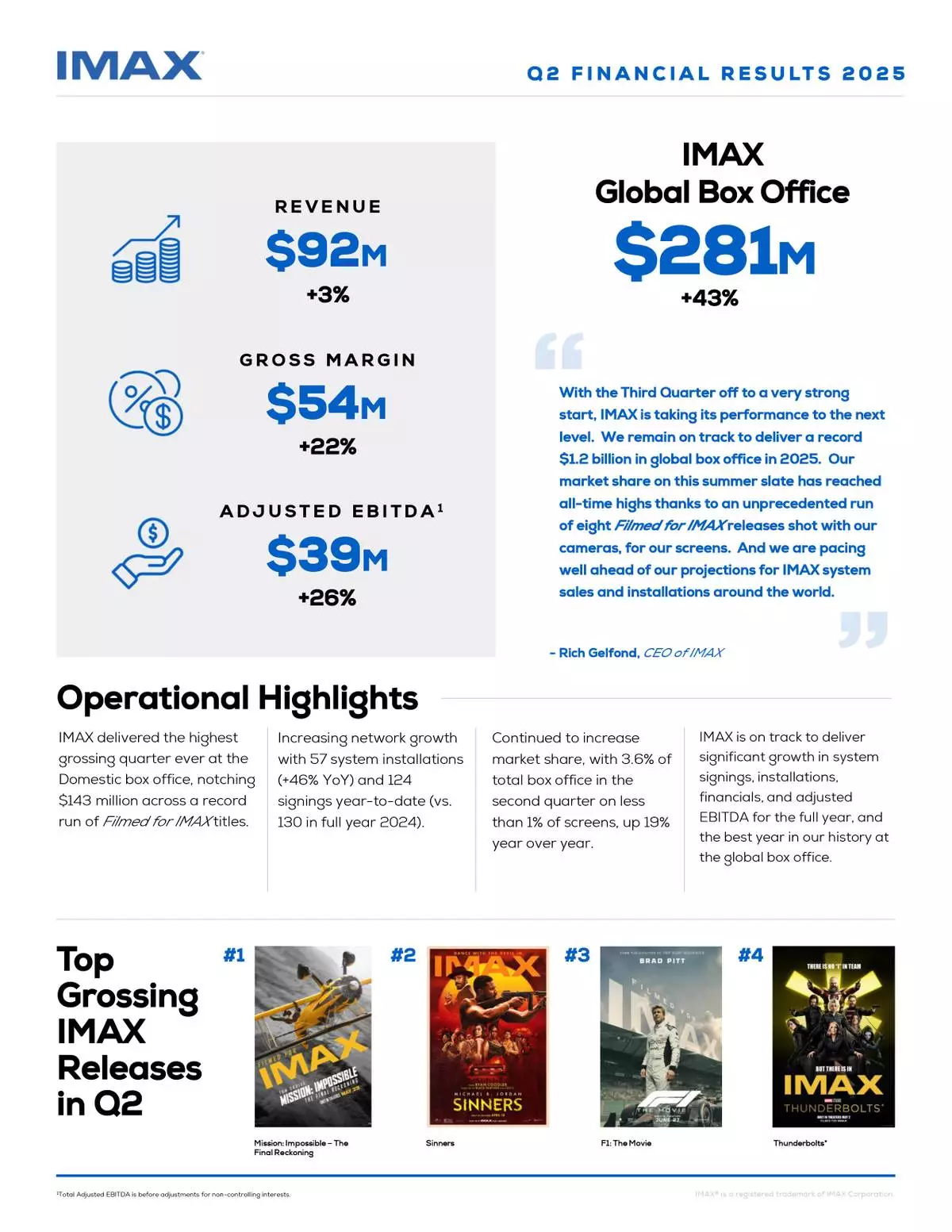 “With the Third Quarter off to a very strong start, IMAX is taking its performance to the next level year to date. We remain on track to deliver a record $1.2 billion in global box office in 2025. Our market share on this summer slate has reached all-time highs thanks to an unprecedented run of eight Filmed for IMAX® releases shot with our cameras, for our screens. And we are pacing well ahead of our projections for IMAX system sales and installations around the world.”