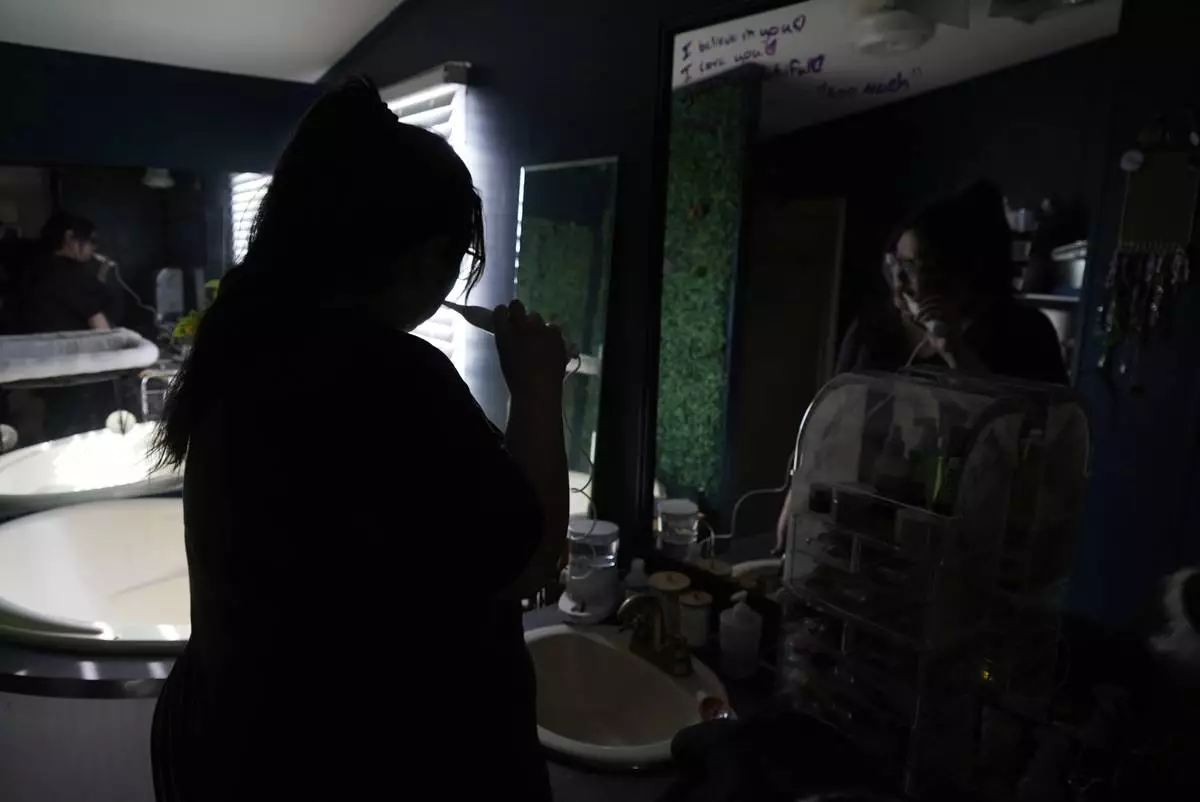 Victoria Silva brushes their teeth with filtered water Wednesday, Feb. 12, 2025, in Fort Collins, Colo. (AP Photo/Brittany Peterson)