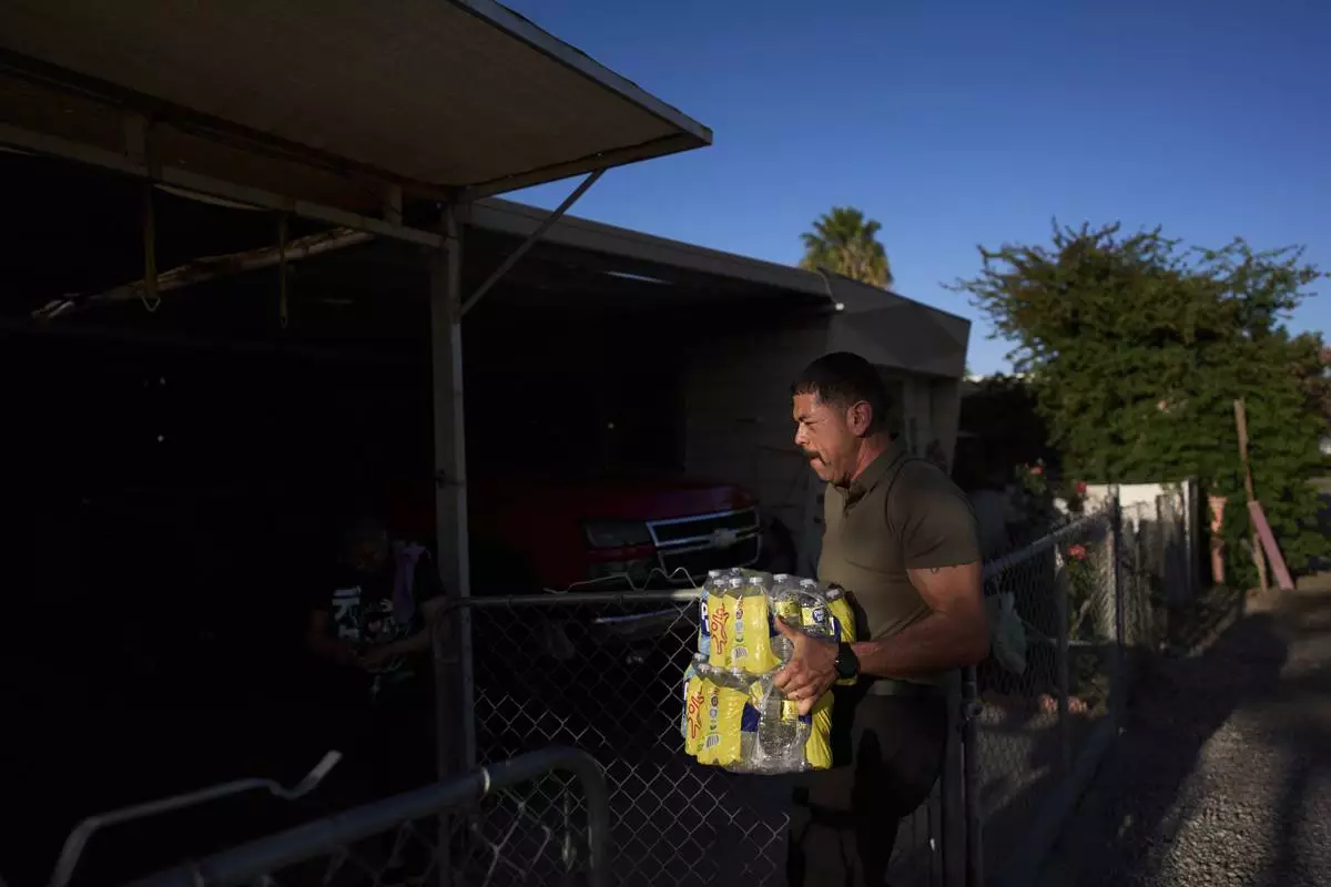 Gerardo Sanchez, an outreach coordinator with the immigrant and farmworker justice group TODEC, helps deliver bottled water to mobile home residents in Oasis, Calif., Monday, April 14, 2025. (AP Photo/Jae C. Hong)