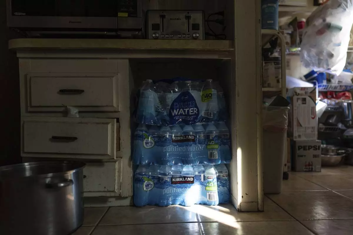 Cases of bottled drinking water are stored under a kitchen counter in the home of Agustin and Ricarda Toledo in Oasis, Calif., Wednesday, Oct. 30, 2024. (AP Photo/Jae C. Hong)