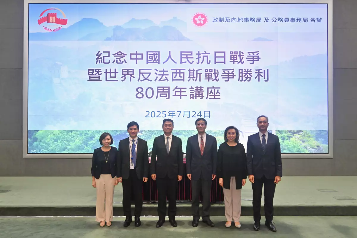 The Civil Service Bureau and the Constitutional and Mainland Affairs Bureau jointly organised a talk to commemorate the 80th anniversary of victory in the Chinese People's War of Resistance against Japanese Aggression and in the World Anti-Fascist War at the Central Government Offices today (July 24). The talk was delivered by the professor at the Institute of World History of the Chinese Academy of Social Sciences (CASS) and the School of History of the University of the CASS, Professor Wang Chaoguang, and Associate Vice President of Lingnan University Professor Lau Chi-pang.