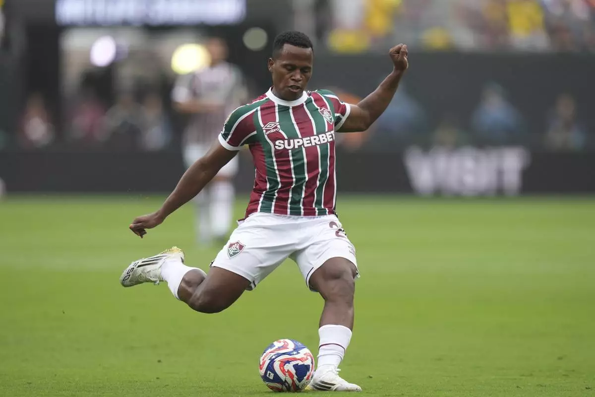 FILE - Fluminense's Jhon Arias (21) competes for the ball during the Club World Cup quarterfinal soccer match between Fluminense and Al Hilal, July 4, 2025 in Orlando, Fla. (AP Photo/Phelan M. Ebenhack, file)