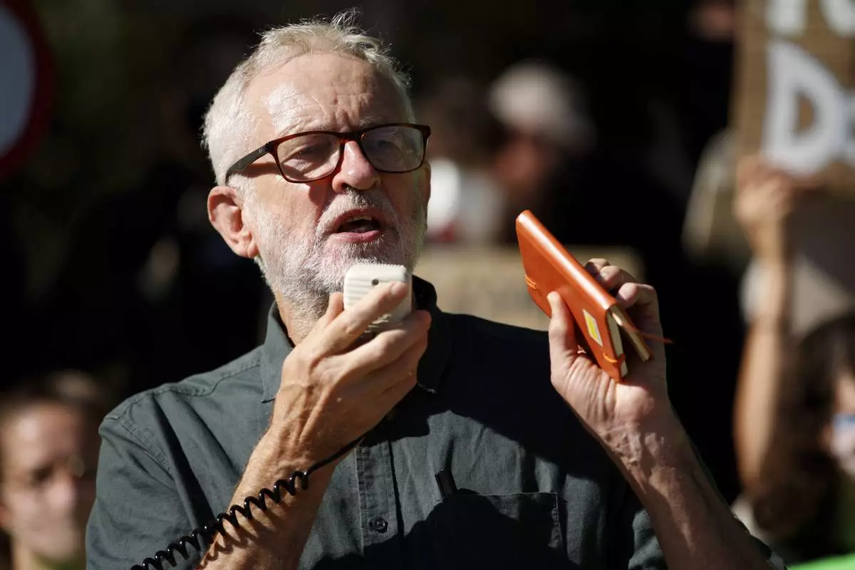 FILE - Former British Labour Party leader Jeremy Corbyn addresses activists at a 'climate strike' demonstration, part of the global 'Fridays for Future' movement led by Swedish teenage environmentalist Greta Thunberg, in Parliament Square in London, Sept. 24, 2021. (AP Photo/David Cliff, File)