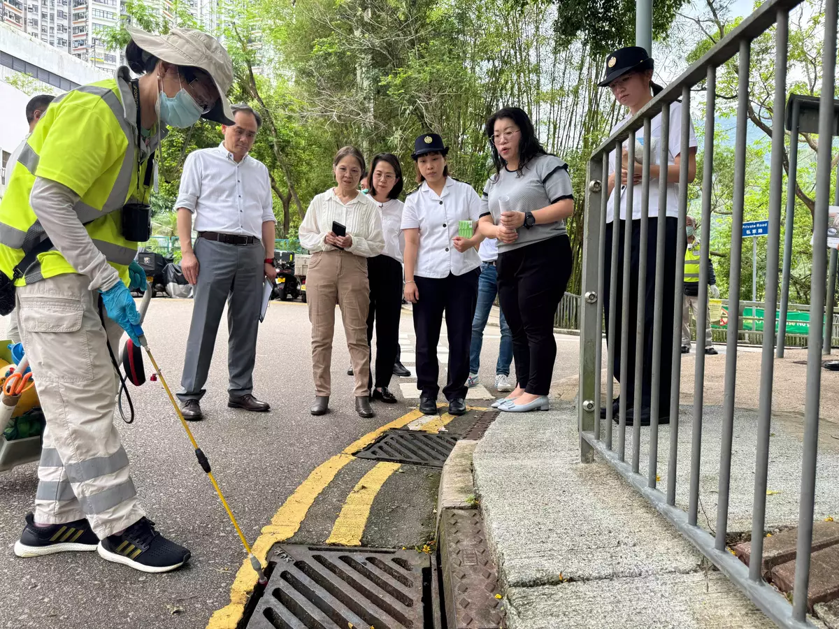 Following the meeting of the Pest Control Steering Committee yesterday (July 23), the Government and stakeholders are progressively strengthening efforts to prevent chikungunya fever (CF). The Under Secretary for Environment and Ecology, Miss Diane Wong, and Assistant Director (Operations) of the Food and Environmental Hygiene Department (FEHD) Mr Wan Chi-shun visited the area around Greig Road in the Eastern District today (July 24) to inspect the enhanced CF prevention efforts in the community.