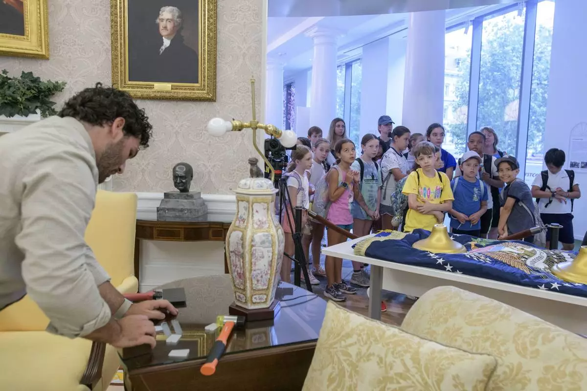 While a group of children look on, Luke Boorady works with a lamp during work to transition a replica of the White House Oval Office from the days of former President Joe Biden with President Donald Trump's decor, at the White House Historical Association in Washington, Wednesday, July 23, 2025. (AP Photo/Rod Lamkey, Jr.)