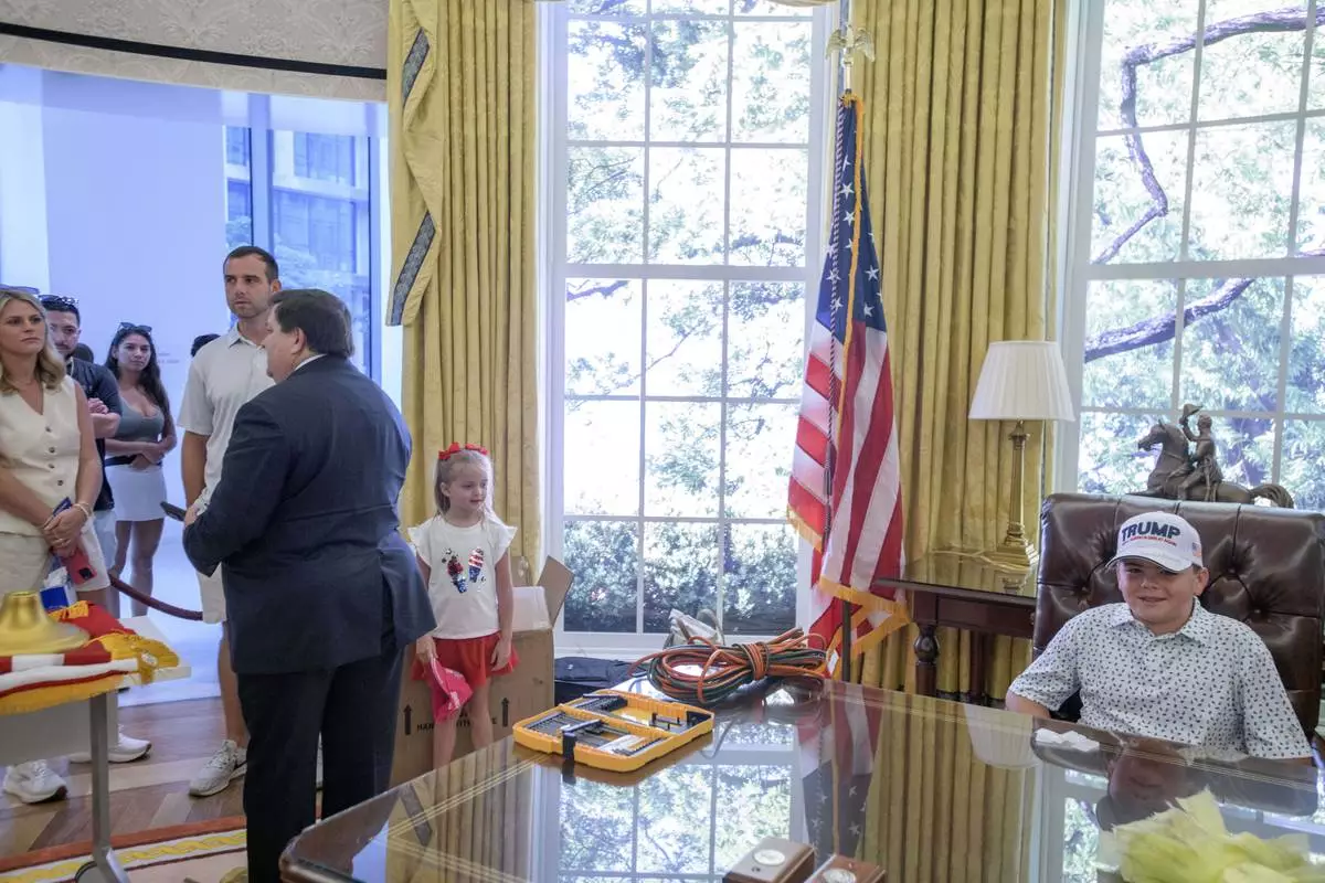 John Michael Cannette,10, right, of Sumrall, Miss., sits behind the Resolute desk as White House Historical Association President Stewart McLaurin, left, talks to a group of tourists, during work to transition a replica of the White House Oval Office from the days of former President Joe Biden with President Donald Trump's decor, at the White House Historical Association in Washington, Wednesday, July 23, 2025. (AP Photo/Rod Lamkey, Jr.)