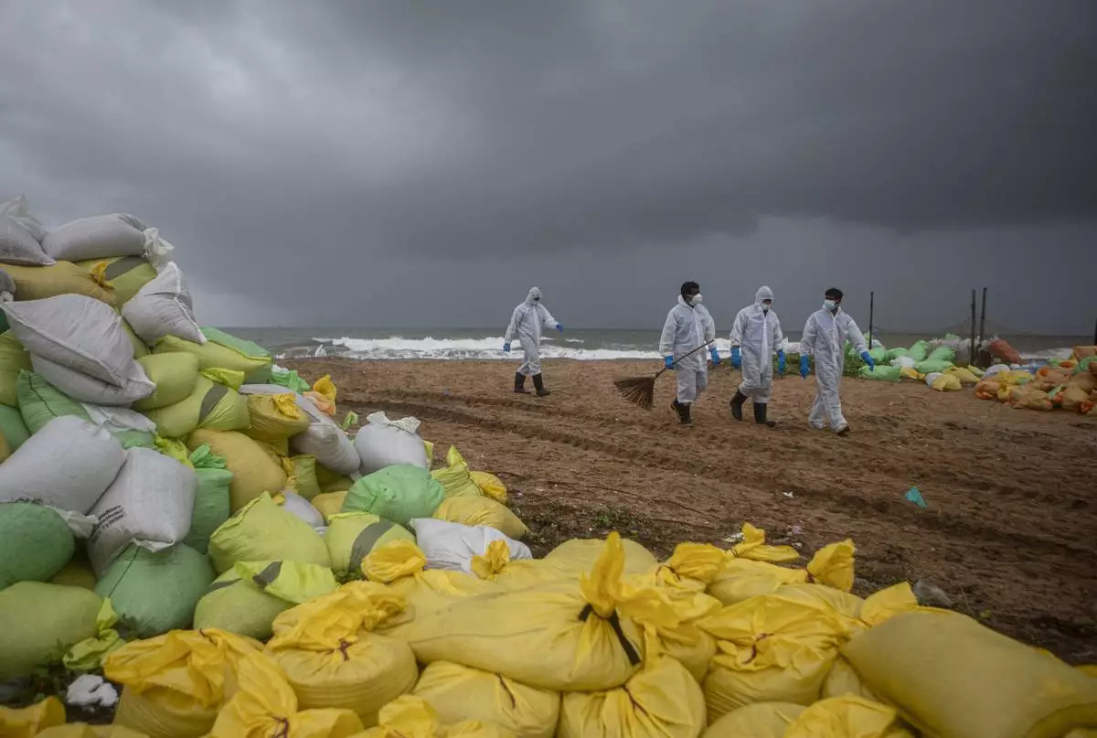 FILE - Sri Lankan navy soldiers walk on the beach looking for plastic debris washed ashore from the fire damaged container ship MV X-Press Pearl at Kapungoda, on the outskirts of Colombo, Sri Lanka, June 14, 2021. (AP Photo/Eranga Jayawardena, File)