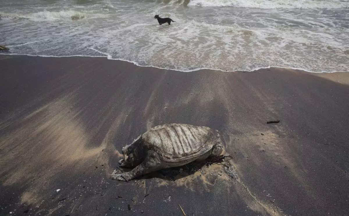FILE - A stray dog stands amid the waves as decomposed remains of a turtle lies on a polluted beach following the sinking of a container ship, the X-Press Pearl, a Singapore-flagged ship, that caught fire while transporting chemicals off Kapungoda, outskirts of Colombo, Sri Lanka, June 21, 2021. (AP Photo/Eranga Jayawardena, File)