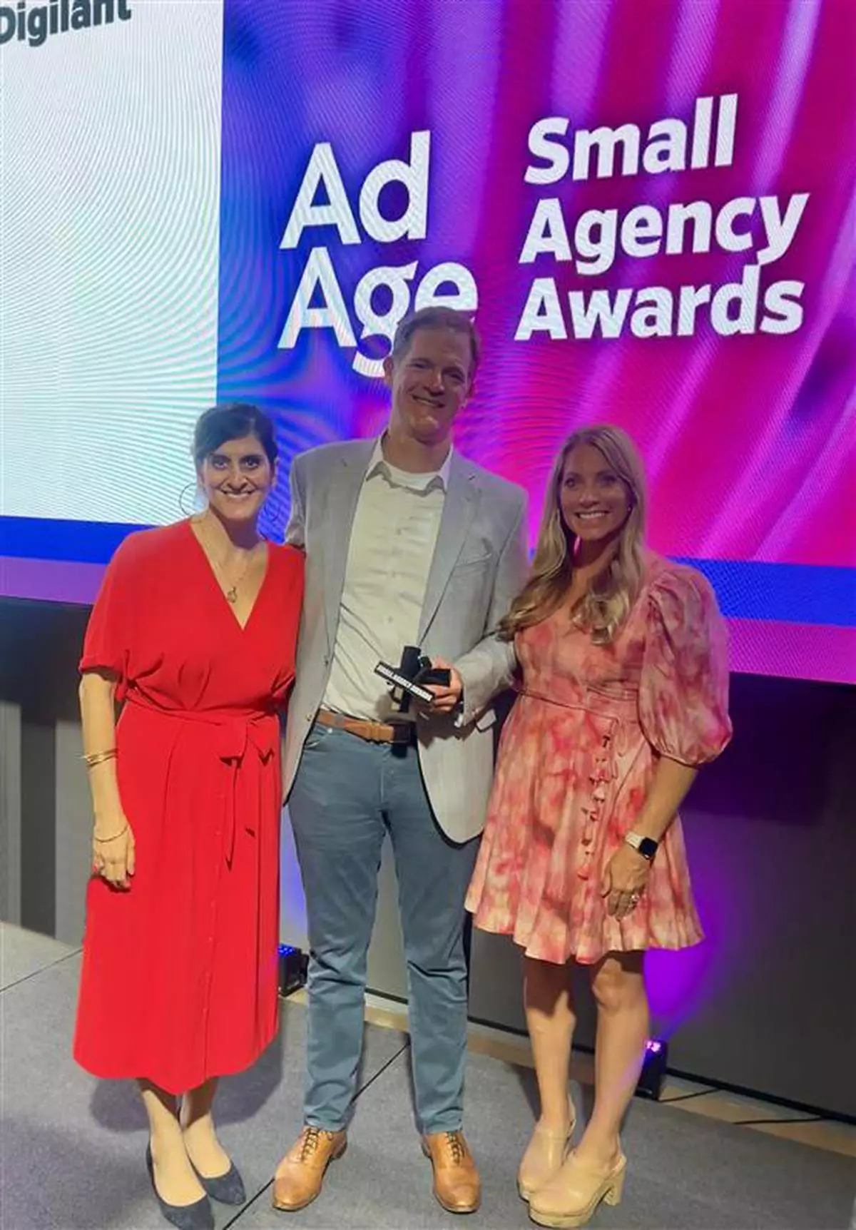"Best Agency Culture Silver" at the 2025 Ad Age Small Agency Awards in Toronto. Left to right: Leyla Touma Dailey, John Birnsteel, Claire Tidmore