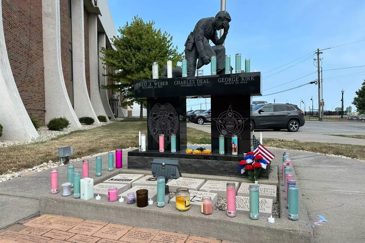 Candles sit on a memorial outside the police department in Lorain, Ohio, on Thursday, July 24, 2025, a day after three officers were wounded in a shooting ambush. (AP Photo/John Seewer)
