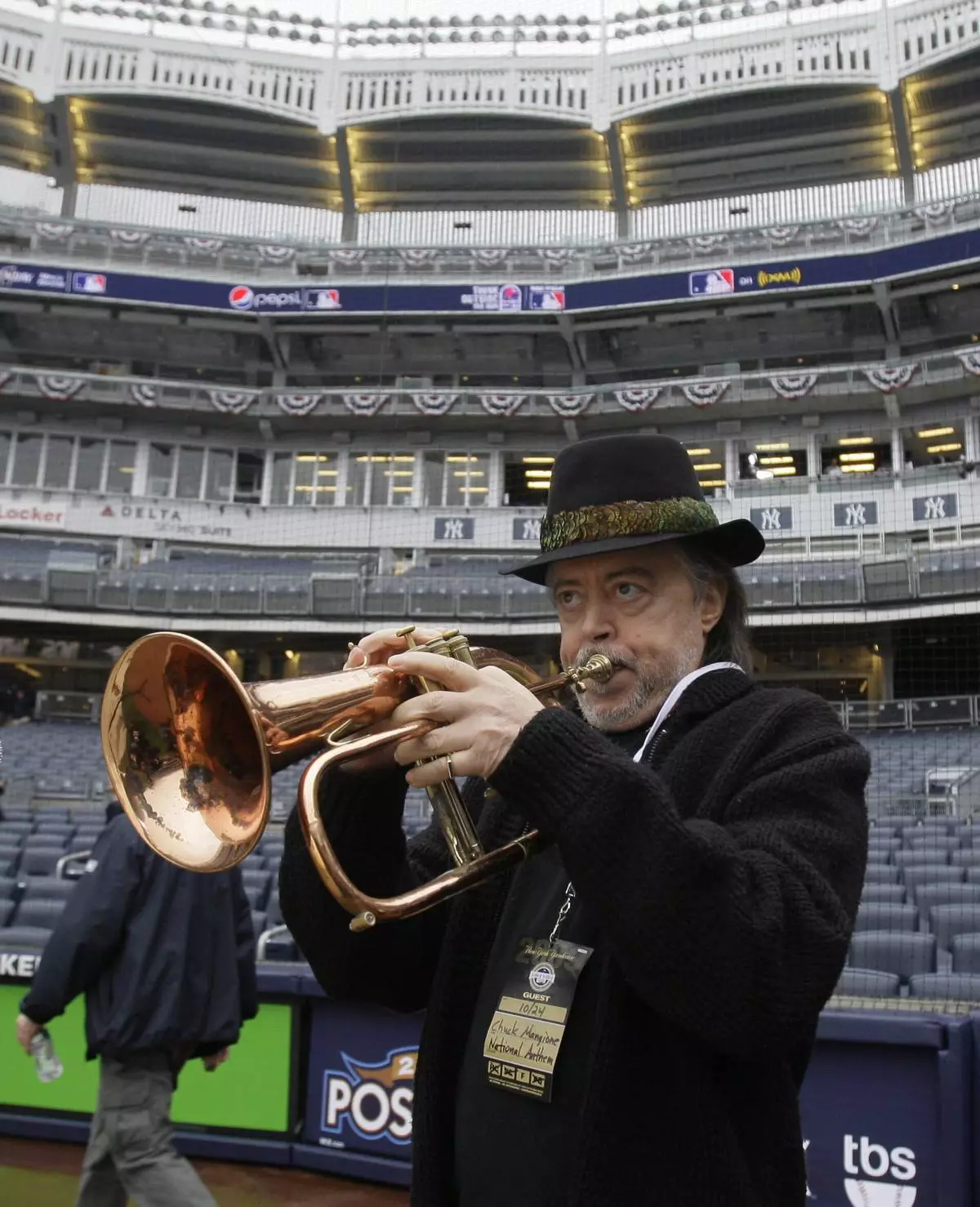 FILE - Flugelhorn player Chuck Mangione rehearses the national anthem before a baseball game between the Los Angeles Angels and New York Yankees, Oct. 24, 2009, in New York. (AP Photo/Elise Amendola, file)