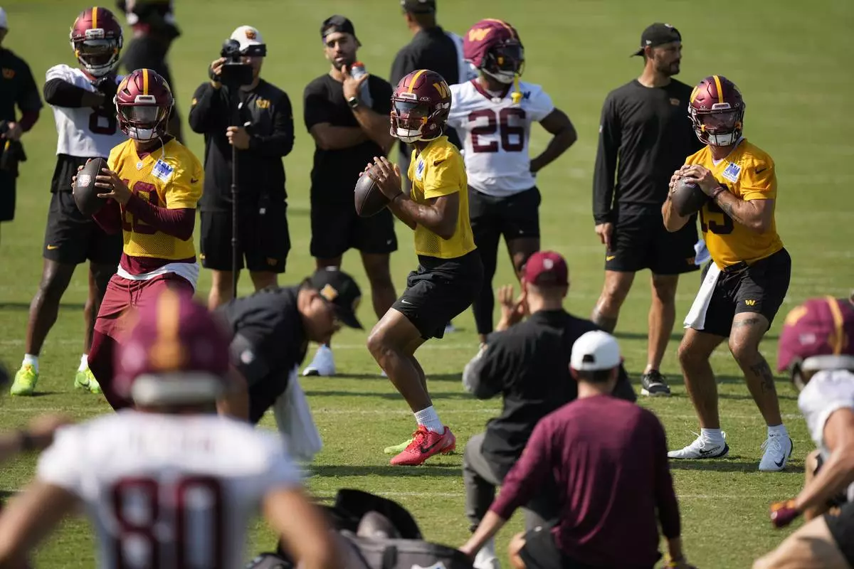 Washington Commanders quarterbacks, from left, Marcus Mariota (18), Jayden Daniels (5), and Sam Hartman (15) drop back to pass during practice at the team's NFL football training camp, Thursday, July 24, 2025, in Ashburn, Va. (AP Photo/Mark Schiefelbein)