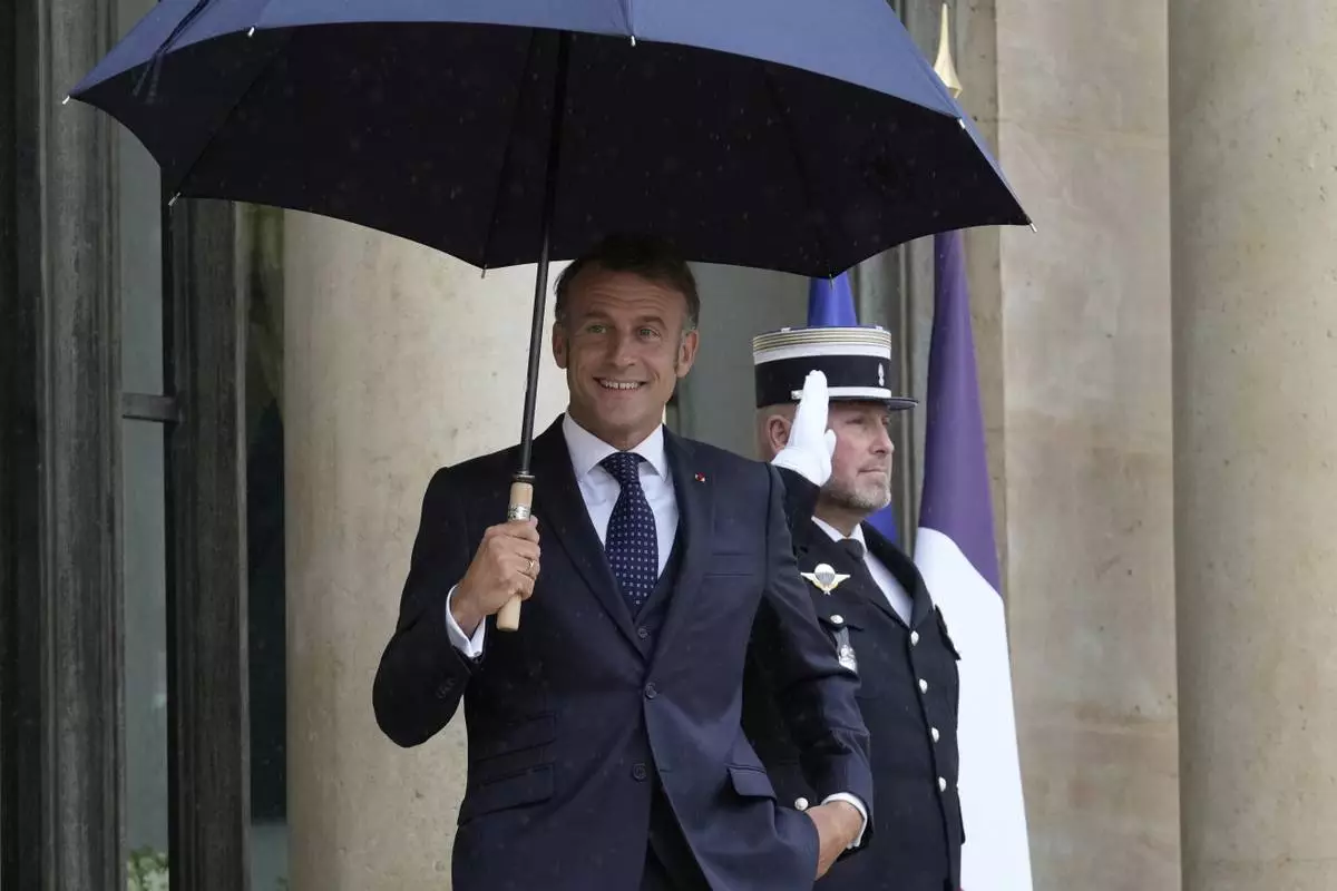 French President Emmanuel Macron uses an umbrella as he waits for Lebanese Prime Minister Nawaf Salam Thursday, July 24, 2025 at the Elysee Palace in Paris. (AP Photo/Michel Euler)
