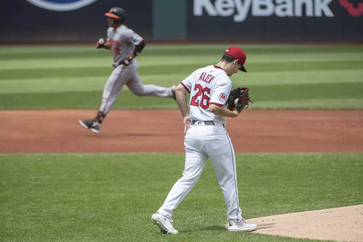 Cleveland Guardians starting pitcher Logan Allen (26) turns his back as Baltimore Orioles' Ramon Laureano rounds the bases after hitting a two-run home run during the first inning of a baseball game, Thursday, July 24, 2025, in Cleveland. (AP Photo/Phil Long)