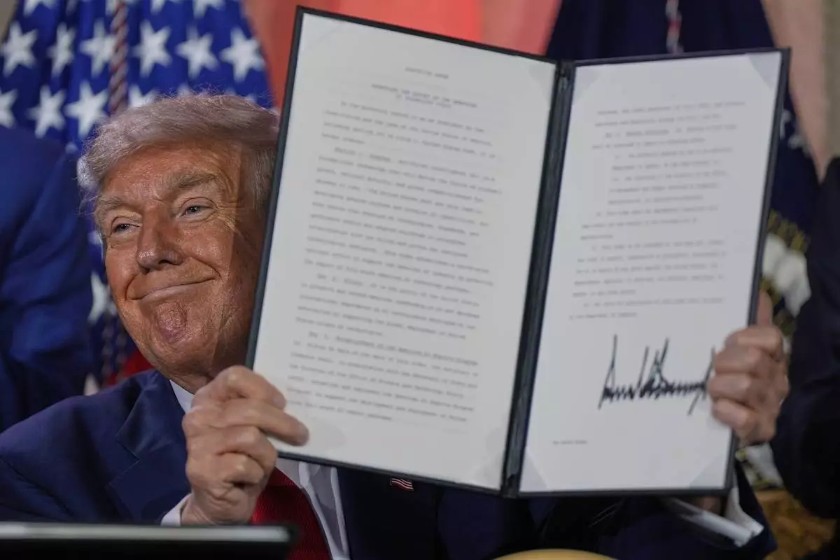 President Donald Trump holds a signed executive order after speaking during an AI summit at the Andrew W. Mellon Auditorium, Wednesday, July 23, 2025, in Washington. (AP Photo/Julia Demaree Nikhinson)