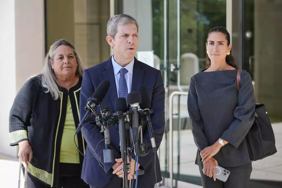 David Oscar Markus, attorney for Ghislaine Maxwell, center, speaks during a news conference outside the federal courthouse in Tallahassee, Fla., Thursday, July 24, 2025. Behind him is Leah Saffian, co-attorney, left, and Mellissa Madrigal, right. (AP Photo/John Raoux)