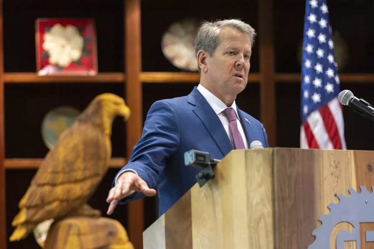FILE - Gov. Brian Kemp speaks before signing Hurricane Helene relief bills at the Georgia Forestry Association in Forsyth, Ga., on May 8, 2025. (Arvin Temkar/Atlanta Journal-Constitution via AP, File)